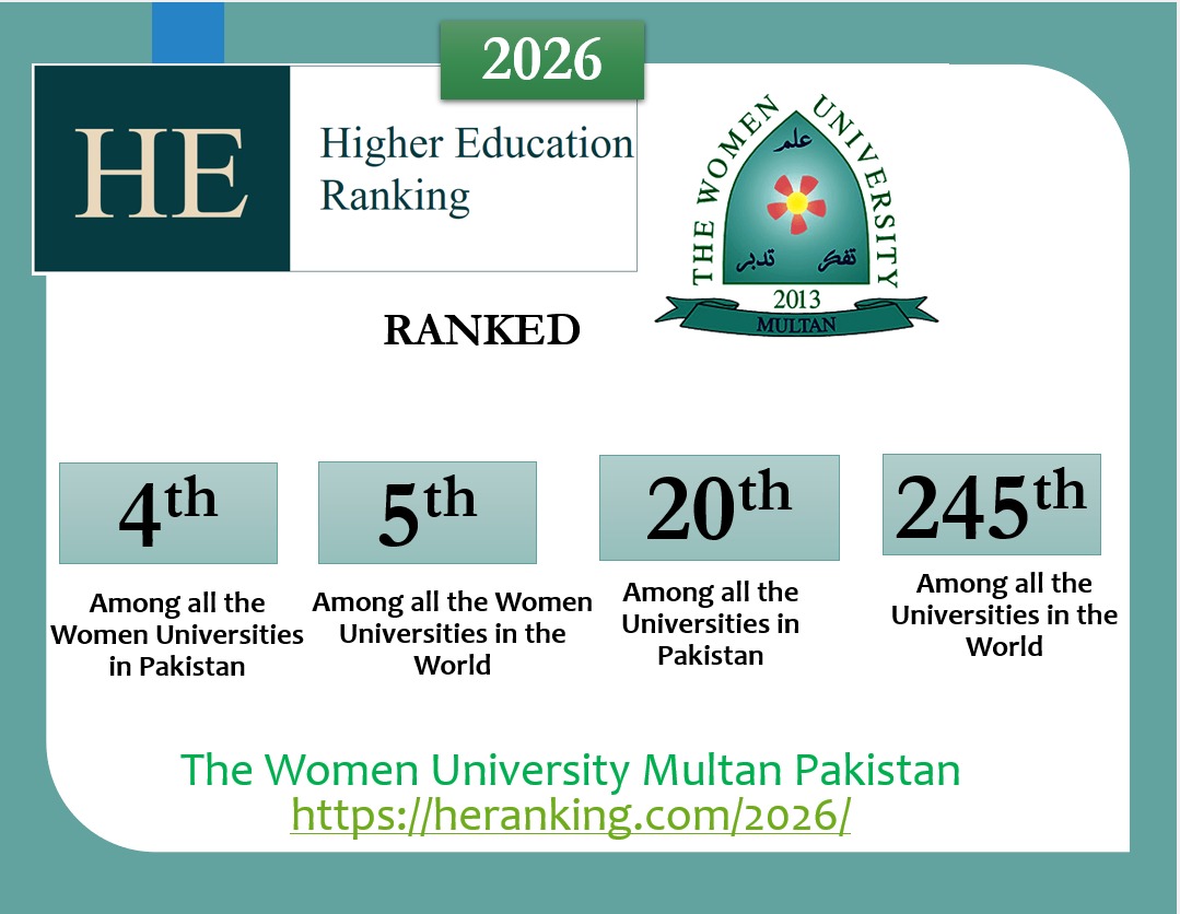 Women University Multan has achieved a remarkable milestone by securing prestigious positions in the Higher Education Ranking (HE) 2026, reinforcing its growing reputation as a center of academic excellence at both national and international levels. The university has been ranked 4th among women universities in Pakistan, 5th among women universities worldwide, 20th among all universities in Pakistan, and 245th among universities across the globe, reflecting its strong academic performance and continuous progress.